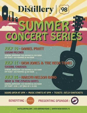 SANTA ROSA BEACH — On Saturdays in July, Distillery 98 will host a Summer Concert Series presented by Step One Automotive Group featuring an array of local and national bands, including Daniel Pratt, Dion Jones and The Neon Tears, and the Raelyn Nelson Band, with proceeds benefiting The Ohana Institute.