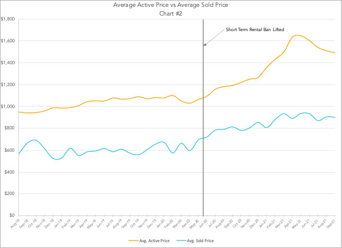 To describe the real estate market on the Emerald Coast in the last 18 months as brisk would be an understatement. It has been red hot. Since the lifting of the short-term rental ban in May 2020, the market has seen a rapid growth in the number of transactions. This growth subsequently reduced the amount of available inventory. The graph below (Chart #1) shows the number of properties listed for sale (orange line) and the number of pended transactions (turquoise line) for each month during the last three years through 9/30/21.