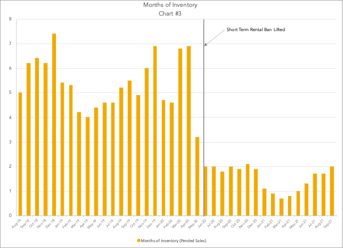 This chart (Chart #2) shows the average list price for active properties (orange line) and the average sold price (turquoise line). This chart shows the rapid growth in list prices starting around December 2020, peaking in May 2021. Interestingly, the average sold priced maintained its consistent price growth with a little leveling off during the last six months. In contrast, the average list price has had a decline since its peak in May. Keep in mind that even with this pull back in list prices, prices remain higher than in the pre-COVID period and for a year after the lifting of the short-term rental ban. In addition(Chart #3), the inventory of available listings remains very low at 2.0 months of inventory.