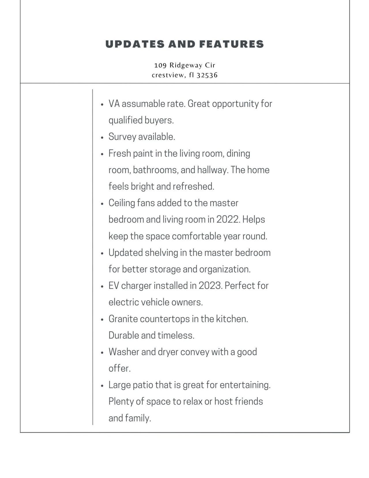 Welcome to 109 Ridgeway Circle. This beautifully maintained all brick home is move in ready and offers modern features, thoughtful updates, and a VA assumable loan, making it an excellent opportunity for buyers and the perfect starter home.Located in a well kept community where residents enjoy access to a community pool and pavilion, the home also offers convenient proximity to Eglin Air Force Base and easy access to the amenities of Crestview.Inside, the home features granite countertops, abundant shelving, and generous closet space that add both style and functionality. Tons of natural light fill the home, creating a bright and welcoming feel throughout the main living areas. The functional layout is inviting and comfortable, with ceiling fans in both the living room and the primary bedroom for year round comfort.The primary suite offers a relaxing retreat with a spacious garden tub, separate shower, and updated closet shelving that provides smart storage and organization. Custom blinds throughout the home add both style and privacy.Outside, enjoy the large backyard patio, perfect for entertaining, grilling, or relaxing. The home also includes an EV charger, offering convenience for electric vehicle owners and the ability to charge overnight during off peak hours. A two car garage and durable all brick exterior complete this well maintained property.109 Ridgeway Circle offers the perfect blend of comfort, convenience, and modern living in a home that is truly ready for its next owner.
