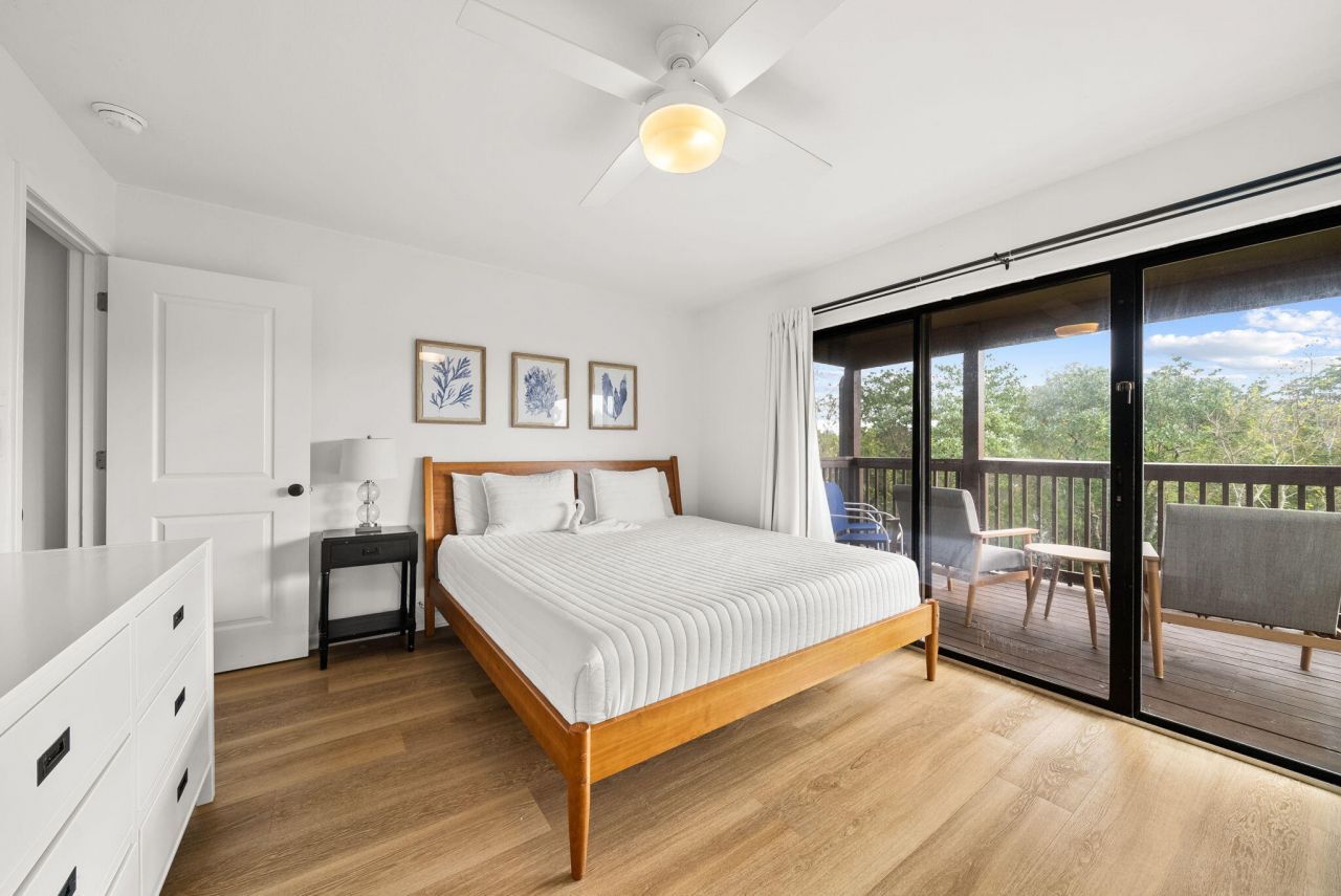 17620 Front Beach Road, Unit J2, located in the Portside Condo community, offers 2 bedrooms, 2.5 bathrooms, and 1,120 sqft with vinyl flooring throughout. The downstairs features an updated kitchen with open shelving and a breakfast bar overlooking the living area, plus a convenient half bath for guests and updated light fixtures. Sliding glass doors lead to a covered back patio with a storage closet and views of the grassy common area. Upstairs, the primary bedroom includes a private balcony and an updated bathroom with a shower/tub combo. The second bedroom features a walk-in closet and access to the second full bathroom. This unit is turn-key and short-term rental ready.