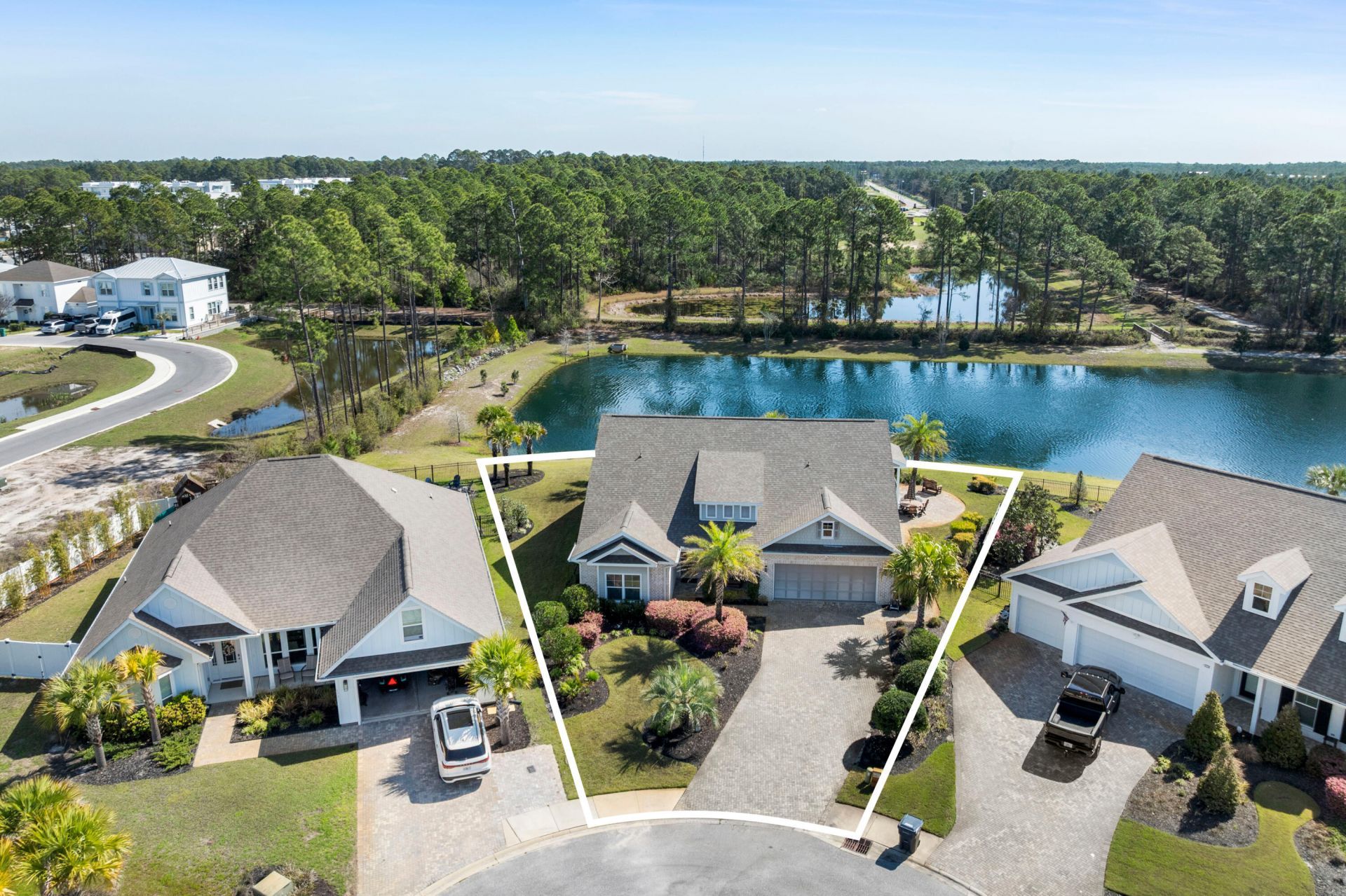 Welcome to refined coastal living in this stunning Craftsman-style lakefront residence, custom built by Steve Mitchell of Driftwood Custom Homes. Ideally situated on a quiet cul-de-sac within a gated, non-rental community, this 4-bedroom, 4-bath home with a dedicated office and second-floor bonus room offers 2,975 square feet of thoughtfully designed living space, .24 of an acre lot and 126 feet of frontage on a serene, four-acre spring-fed lake. Lakeview Subdivision is surrounded by Walton County owned land and State Park property. Located off of Thompson Road just 0.4 miles to Santa Rosa Golf & Beach Club and approximately 0.7 miles to Scenic 30A and several beach accesses via Allen Loop Drive and East Seashore Circle South. Designed for both comfort and entertaining, this two-story home features two fireplaces (indoor and outdoor), tiled covered porch with outdoor fireplace and large ceiling fan in the back yard, outdoor shower, expansive brick paver patios, a private outdoor wood burning fire pit, and lush tropical landscaping. The main level showcases a spacious primary suite overlooking the lake, along with an additional guest bedroom, private office, and convenient laundry room with custom cabinets and laundry sink. Upstairs, you'll find two additional bedrooms, a second living area/bonus room, and an additional office space--perfect for guests or multi-generational living. A second primary suite upstairs features a private balcony overlooking the lake and a large walk-in closet.The kitchen is beautifully appointed with quartz countertops, a walnut island countertop finished with linseed oil, gas range, Frigidaire appliances, and custom cabinetry. Additional upgrades include raised ceilings in living area, crown molding throughout, custom window blinds, custom built in closets in both master bedrooms, a Culligan water filtration system, impact resistant windows and doors, fully irrigated yard with irrigation well, bead board along the walls and ship lap over the living room fireplace, gas hot water heater, gas fireplaces, exterior is a combination of brick and cement fiber siding, brick paver driveway with room for 4+ cars, tiled garage floor, and professionally designed landscaping!Enjoy the benefits of a golf cart-friendly neighborhood with a community pool with bathrooms and bathing facilities, and private path access to Helen McCall Park--a beloved local destination featuring a splash pad, playgrounds, sports fields, a real skate park, walking trails, and picnic areas. Sit outside and enjoy the tropical paradise, build a fire in the outdoor fire pit, enjoy all the wild birds who visit daily or fish right out of your own backyard! With low HOA fees of just $275/month and a peaceful setting in the back of the neighborhood, this exceptional lakefront home offers the perfect blend of luxury, privacy, and proximity to the best of 30A living! Near by restaurants include The Vue, Stinky's, all the joys of Gulf Place, Ed Walline beach access and Shunk Gulley. Call and schedule your showing today!