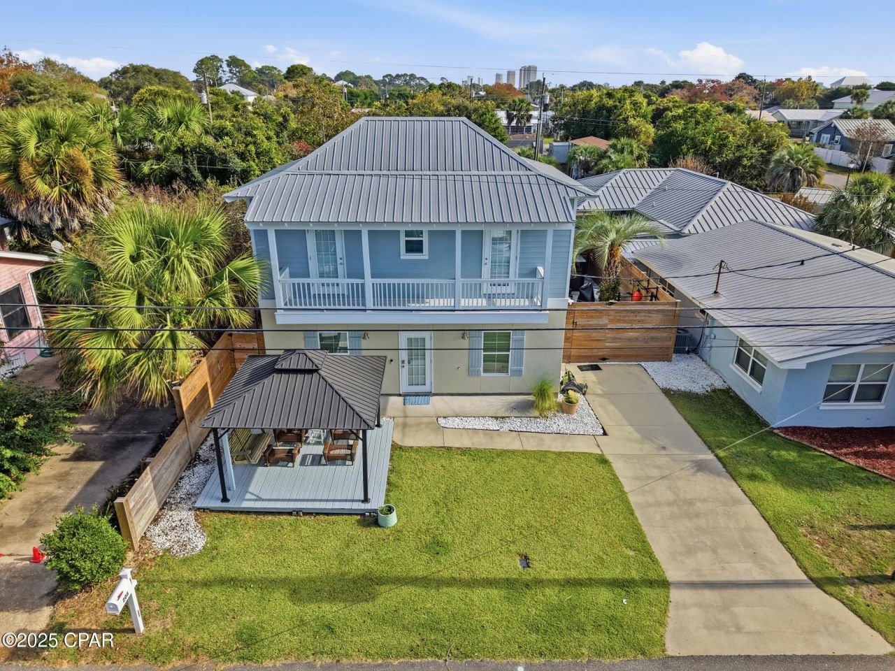 Beautifully updated and fully furnished coastal short-term-rental beach house just steps from your dedicated Laguna Beach access. This two-story home features a metal roof, charming porch swings, and a vaulted balcony perfect for enjoying Gulf breezes. Inside, you'll find an open layout with a bright white kitchen, granite counters, stainless appliances, under-cabinet lighting, new dishwasher, whole outside of house freshly painted, updated light fixtures, new sink disposal, and porcelain tile throughout. Both upstairs bedrooms offer private updated bathrooms and open to the covered balcony. A spacious double bunk room provides a third sleeping area. Over $100,000 in upgrades have transformed this property into a turnkey retreat, including a fully renovated backyard with a luxury swim spa, sauna, cold plunge, complete outdoors workout gym/equipment, no backyard maintenance turf, new fencing and outdoor entertainment lights, outdoor seating, hanging swing chairs and hammock, updated security systems, new mailbox, and more. The home comes stocked with multiple bikes, paddleboard, fully ready beach lounge chairs, and two lockout storage closets. Sleeps eight with a queen pull-out sofa. Optional 2022 Mini Cooper S Convertible is available separately with purchase of house. Short-Term-Rental Projected at up to $90K yearly! Just a 5 min walk to beach access at end of street. Located?1 mile to Carousel Market and Thomas Donuts, 3 miles to Pier Park, and minutes to 30A. Enjoy the highly desirable West End of Panama City Beach, one of the few communities with a dedicated, no high-rise obstructed view of the beachfront, beautiful sought after Laguna Beach!