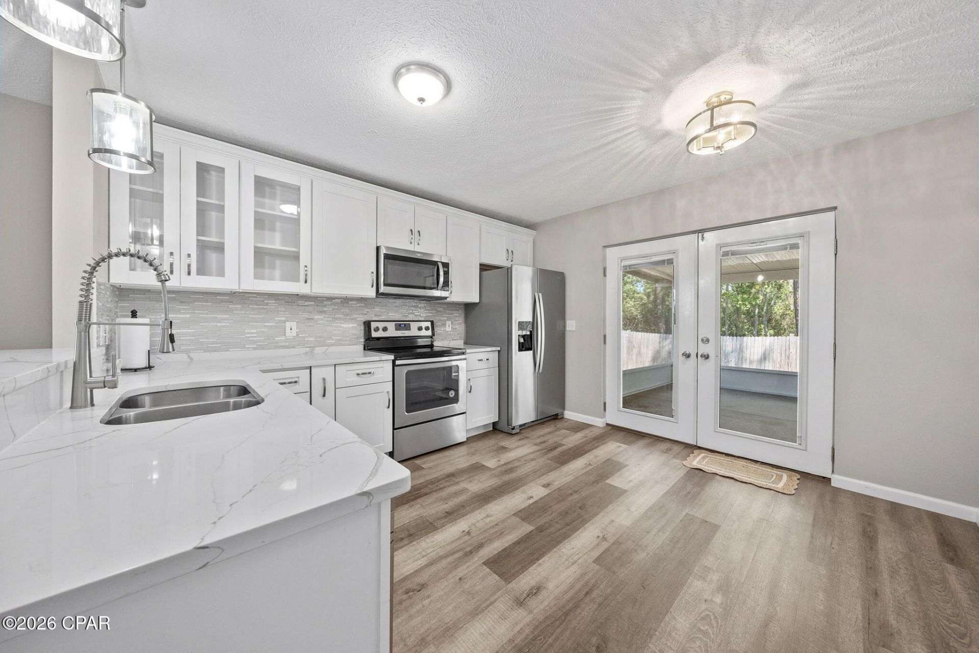 This Sweetwater Village home holds abundant charm starting with the fragrant roses lining the entry path and continues into the spacious living room with vaulted ceilings. The remodeled kitchen is nicely finished with quartz countertops, tile backsplash and SS appliances. French doors let in abundant light in the kitchen and lead out onto a screened porch that is perfect for quiet times taking in the peaceful backyard with no back neighbors! The bright master bedroom has also been updated and features vaulted ceilings with the en suite offering a double vanity with quartz countertops and new standup tile shower. The walk-in closet is conveniently located in the master bath! The split bedroom plan with two additional bedrooms rounds this home out nicely with a remodeled and bright full bath in the hallway and access to the attached garage. This home had a new roof in 2020 and fully fenced backyard. And for allergy sufferers, there's no carpet in sight! Just beautiful and easy LVP! It's a great day to take a look at this one!